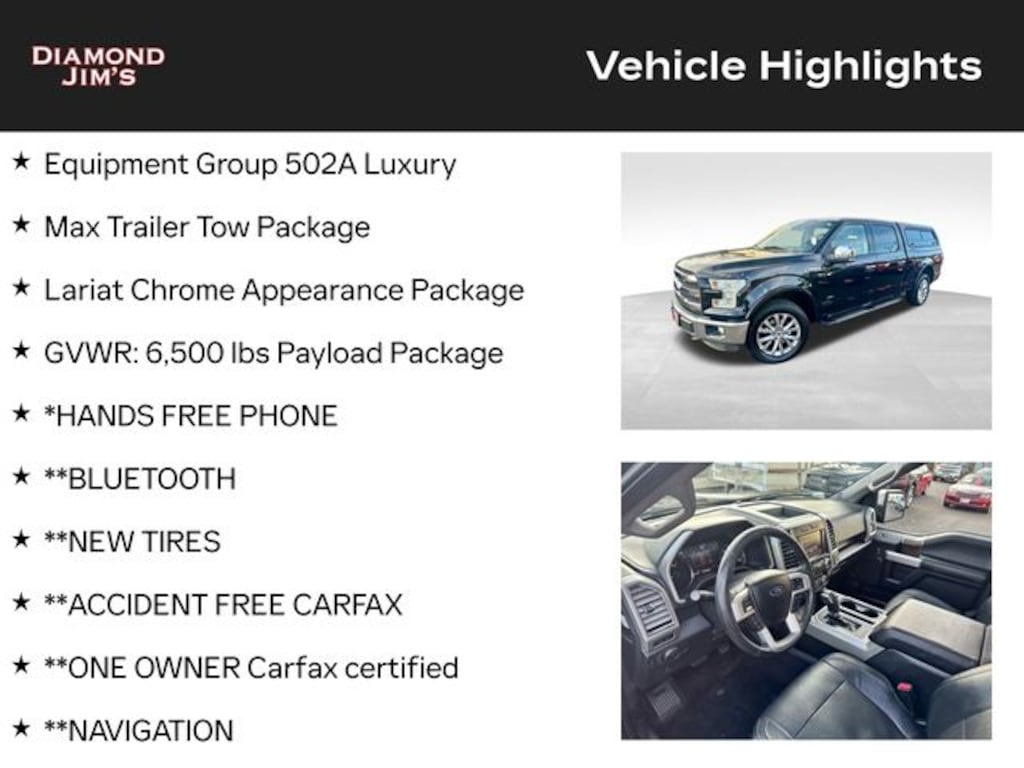 *HANDS FREE PHONE, **BLUETOOTH, **NEW TIRES, **ACCIDENT FREE CARFAX, **ONE OWNER Carfax certified, **NAVIGATION, **LEATHER, **BACK-UP CAMERA, **PANORAMIC ROOF, **TRAILER TOW PACKAGE, **SPRAY-ON BEDLINER, **4X4, **CARFAX BUY BACK GUARANTEE**, **REMOTE KEYLESS ENTRY**, **REMOTE START**, **GREAT WINTER DRIVER**, **HEATED & COOL SEATS, 110V/400W Outlet, 2nd Row Heated Seats, Automatic High Beam w/Rain-Sensing Wipers, BLIS Blind Spot Information System, Chrome 3-Bar Style Grille w/Chrome Surround, Chrome Angular Step Bars, Chrome Door Handles w/Body-Color Bezel, Chrome Skull Caps on Exterior Mirrors, Electronic Locking w/3.55 Axle Ratio, Equipment Group 502A Luxury, GVWR: 6,500 lbs Payload Package, Heated Steering Wheel, Integrated Trailer Brake Controller, Lariat Chrome Appearance Package, Leather-Trimmed Bucket Seats, LED Side-Mirror Spotlights, Max Trailer Tow Package, Navigation System, Power Glass Sideview Mirr w/Chrome Skull Caps, Power Tilt/Telescoping Steering Column w/Memory, Quad Beam LED Headlamps & Taillamps, Radio: Sony Single CD w/HD & SiriusXM Satellite, Remote Start System, Reverse Sensing System, Single-Tip Chrome Exhaust, Universal Garage Door Opener, Voice-Activated Navigation, Wheels: 18" Chrome-Like PVD. Clean CARFAX. CARFAX One-Owner. 4D SuperCrew 3.5L V6 6-Speed Automatic Electronic 4WD Lariat