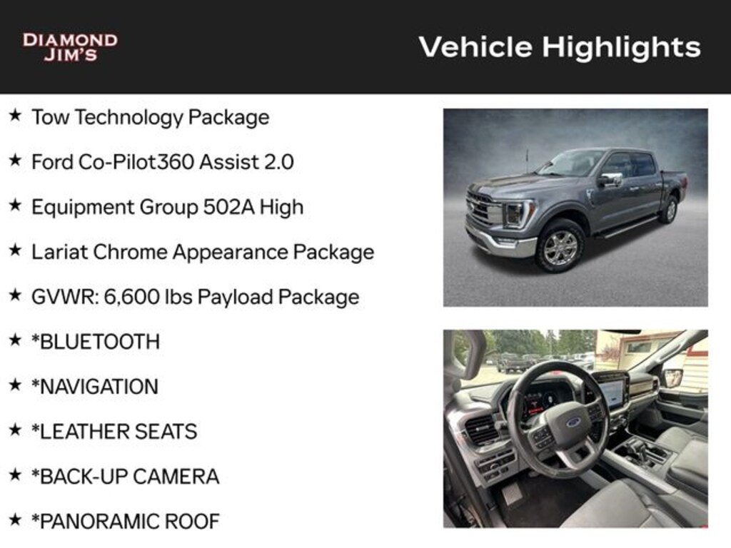 *BLUETOOTH, *NAVIGATION, *LEATHER SEATS, *BACK-UP CAMERA, *PANORAMIC ROOF, *APPLE CARPLAY, *TRAILER TOW PACKAGE, *FOUR WHEEL DRIVE, *WELL MAINTAINED, *BLIND SPOT MONITOR, *REMOTE START, *HEATED STEERING WHEEL, *HEATED & VENTILATED SEATS, *ADAPTIVE CRUISE CONTROL, 2nd Row Heated Seats, 360 Degree Camera, 6" Chrome Running Board, Chrome 2-Bar Grille w/4 Minor Bars, Chrome Door & Tailgate Handles w/Body-Color Bezel, Chrome Single-Tip Exhaust, Chrome Skull Caps on Exterior Mirrors, Connected Built-In Navigation, Equipment Group 502A High, Evasive Steering Assist, Ford Co-Pilot360 Assist 2.0, GVWR: 6,600 lbs Payload Package, Heated Steering Wheel, Integrated Trailer Brake Controller, Intelligent Adaptive Cruise Control w/Stop & Go, Intersection Assist, Lariat Chrome Appearance Package, Leather-Trimmed Bucket Seats, LED Projector w/Dynamic Bending Headlamps, Navigation System, Onboard 400W Outlet, Power Glass Sideview Mirr w/Chrome Skull Caps, Power Tilt/Telescoping Steering Column w/Memory, Pro Trailer Backup Assist, Radio: B&O Sound System by Bang & Olufsen, Rain-Sensing Wipers, Speed Sign Recognition, Tow Technology Package, Universal Garage Door Opener, Wheels: 18" Chrome-Like PVD. CARFAX One-Owner. 4D SuperCrew 2.7L V6 EcoBoost 10-Speed Automatic 4WD Lariat