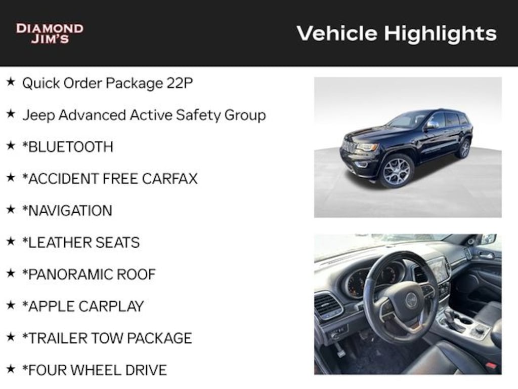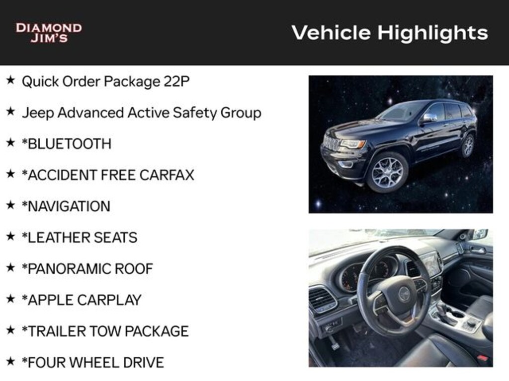 *BLUETOOTH, *ACCIDENT FREE CARFAX, *NAVIGATION, *LEATHER SEATS, *PANORAMIC ROOF, *APPLE CARPLAY, *TRAILER TOW PACKAGE, *FOUR WHEEL DRIVE, *WELL MAINTAINED, *BLIND SPOT MONITOR, *REMOTE START, *HEATED STEERING WHEEL, *HEATED & VENTILATED SEATS, *ADAPTIVE CRUISE CONTROL, *ALLOY WHEELS, Adaptive Cruise Control w/Stop, Advanced Brake Assist, Full Speed FWD Collision Warn Plus, Jeep Advanced Active Safety Group, Lane Departure Warning Plus, Navigation System, Parallel & Perp Park Assist w/Stop, Quick Order Package 22P, Rain Sensitive Windshield Wipers. Clean CARFAX. 4D Sport Utility 5.7L V8 HEMI 8-Speed Automatic 4WD Overland