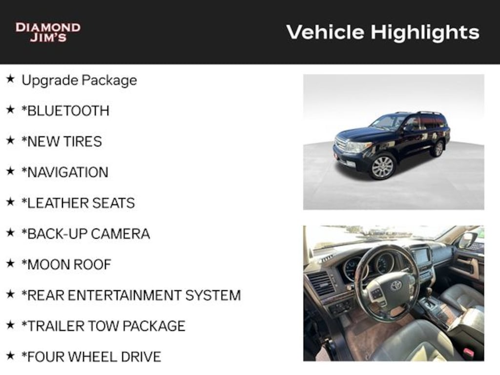*BLUETOOTH, *NEW TIRES, *NAVIGATION, *LEATHER SEATS, *BACK-UP CAMERA, *MOON ROOF, *REAR ENTERTAINMENT SYSTEM, *TRAILER TOW PACKAGE, *FOUR WHEEL DRIVE, *WELL MAINTAINED, *REMOTE KEYLESS ENTRY, *REMOTE START, *HEATED SEATS, *ALLOY WHEELS, Bluetooth®, Center Console Cooler Box, Color-Keyed Rear Spoiler, Headlamp Washers, Integrated Back-Up Camera, Leather Trimmed Shift Lever, Leather Trimmed Steering Wheel, Multi-Information Display, Navigation System, Radio: JBL Synthesis AM/FM w/6-Disc CD/DVD Changer, Rain Sensing Variable Intermittent Wipers, Rear-Seat DVD Entertainment System, Second-Row Multi Stage Seat Heaters, Upgrade Package, Voice Activated Touch-Screen DVD Navigation System. 4D Sport Utility 5.7L V8 SMPI DOHC 6-Speed Automatic 4WD